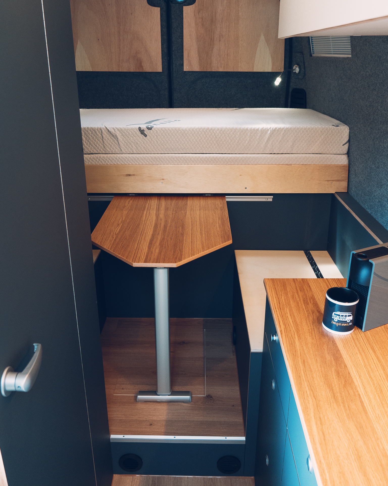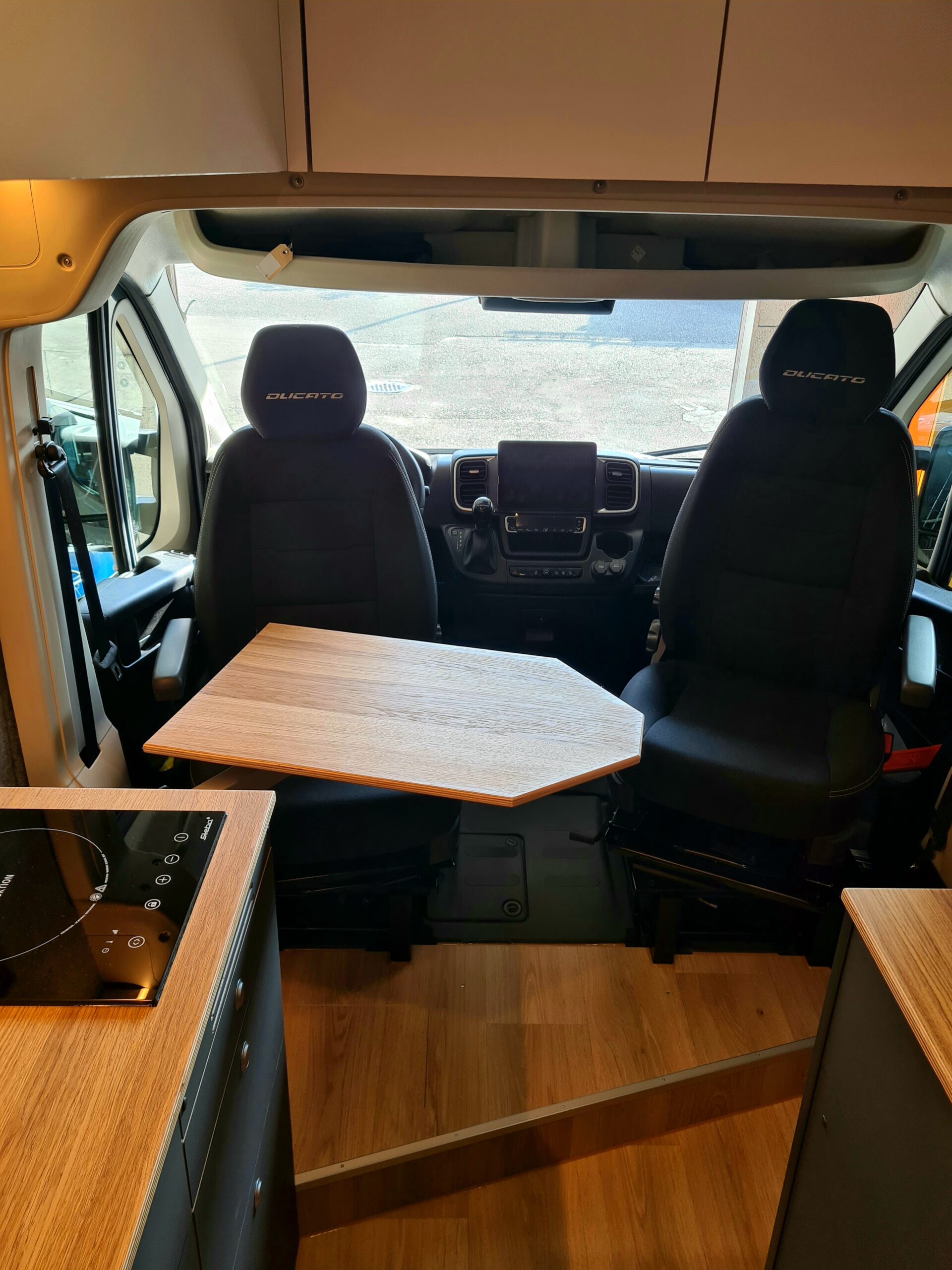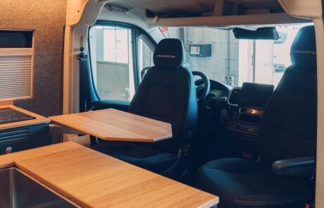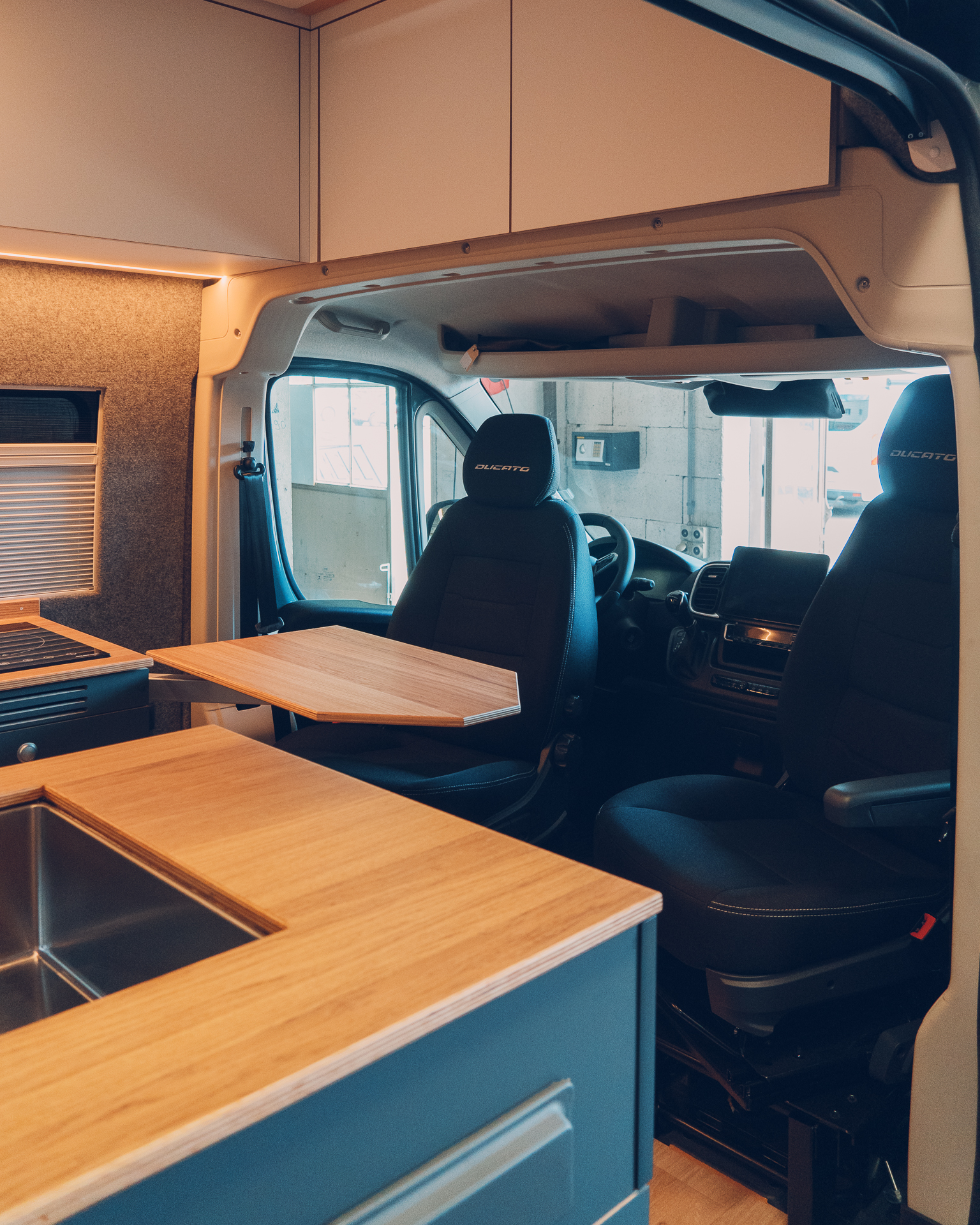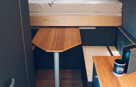 Zu den spezifischen Wünschen gehörten unter anderem ein großzügiges, ausziehbares Längsbett, eine gemütliche Sitzecke, die auch bei rauem Wetter zum Verweilen einlädt, sowie drehbare Fahrersitze, um auch bei ausgezogenem Bett eine bequeme Sitzgelegenheit zu bieten.