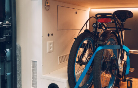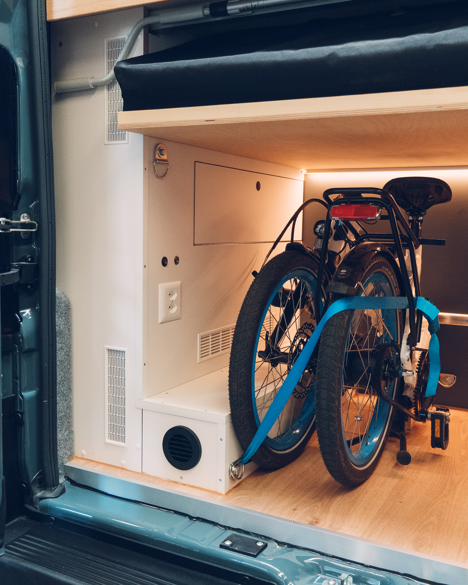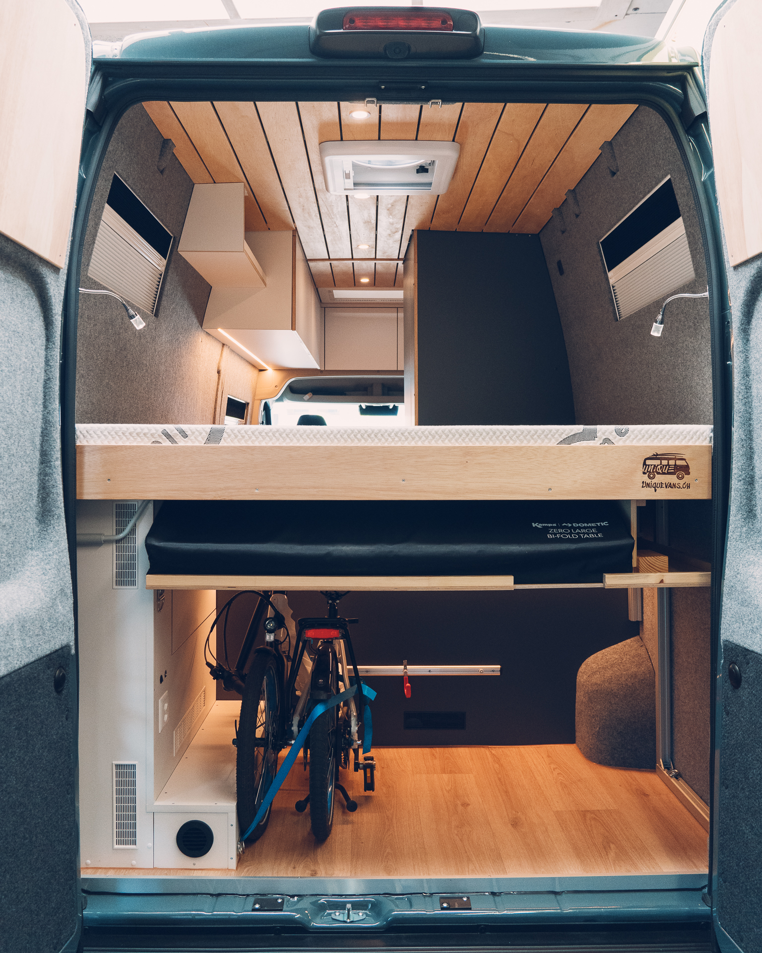 In der Heckgarage steht viel Stauraum zur Verfügung. Hier wurden die umfassende Elektroinstallation, die Heizung, der Tisch und die Stühle sowie die beiden klappbaren Fahrräder untergebracht.