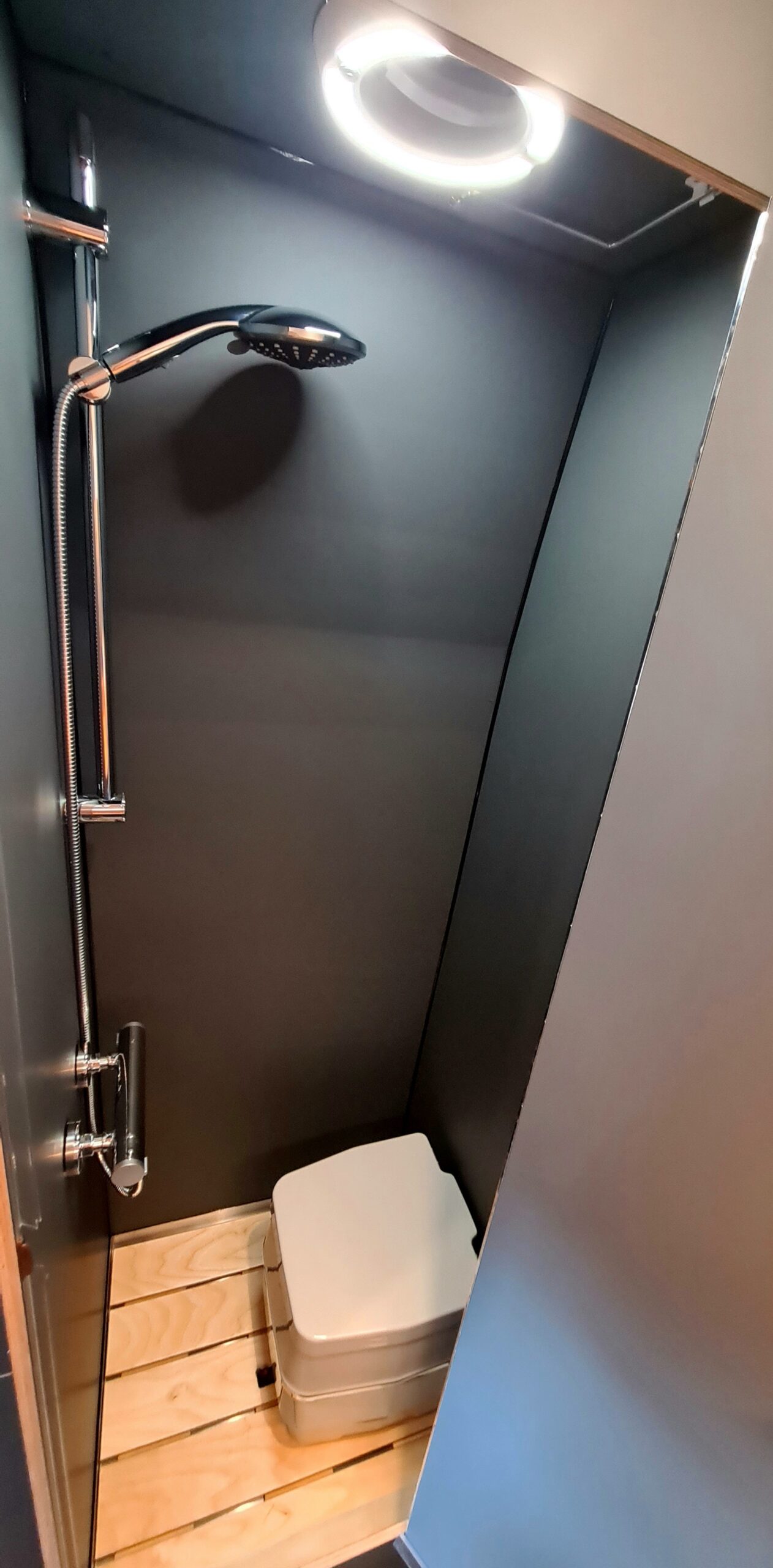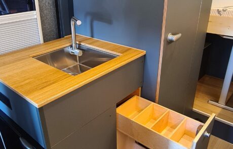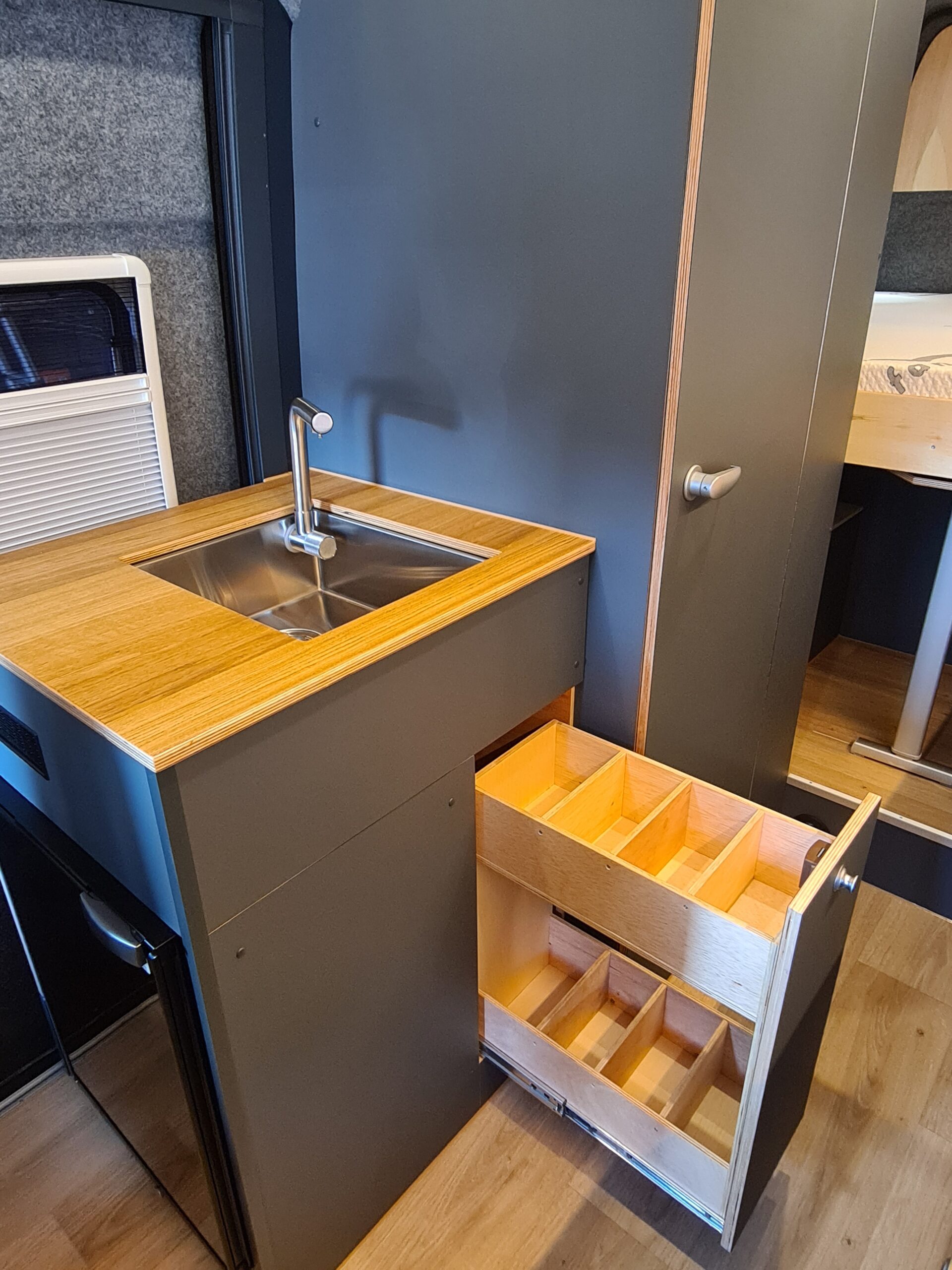 Beim Möbelbau lag der Fokus darauf, möglichst viel Stauraum zu schaffen. Die zahlreichen Schubladen helfen dabei, Ordnung zu halten und das lästige Wühlen auf den Knien zu vermeiden. Die großzügige Nasszelle ermöglicht sowohl eine komfortable, warme Dusche als auch den Zugang zur Toilette. Nasse Kleidung kann dort ebenfalls bestens aufgehängt werden.